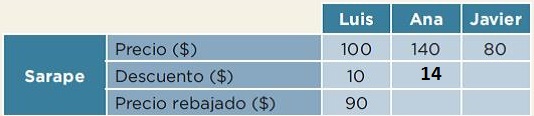 Muestra cinco columnas, tres de ellas representan las tiendas, la de Luis, Ana y Javier. Y en las filas encuentras los objetos que se venden en las tres tiendas: sarape, aretes y blusa. ¿qué datos encuentras en la segunda columna de la tabla?